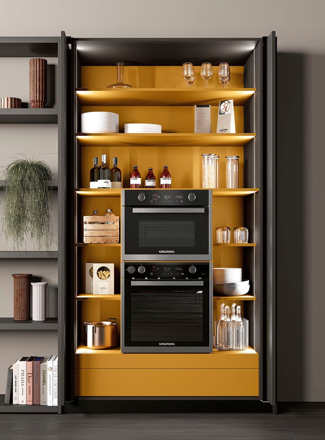 Mustard yellow, symbol of conviviality, warmth, light. It is also thanks to the chromatic choice that the space becomes perfect for storing and arranging all the accessories for the mise en place. From the glasses, to the plate service, up to the actual pantry. Everything takes shape in a mosaic that decorates and captures the eye.
