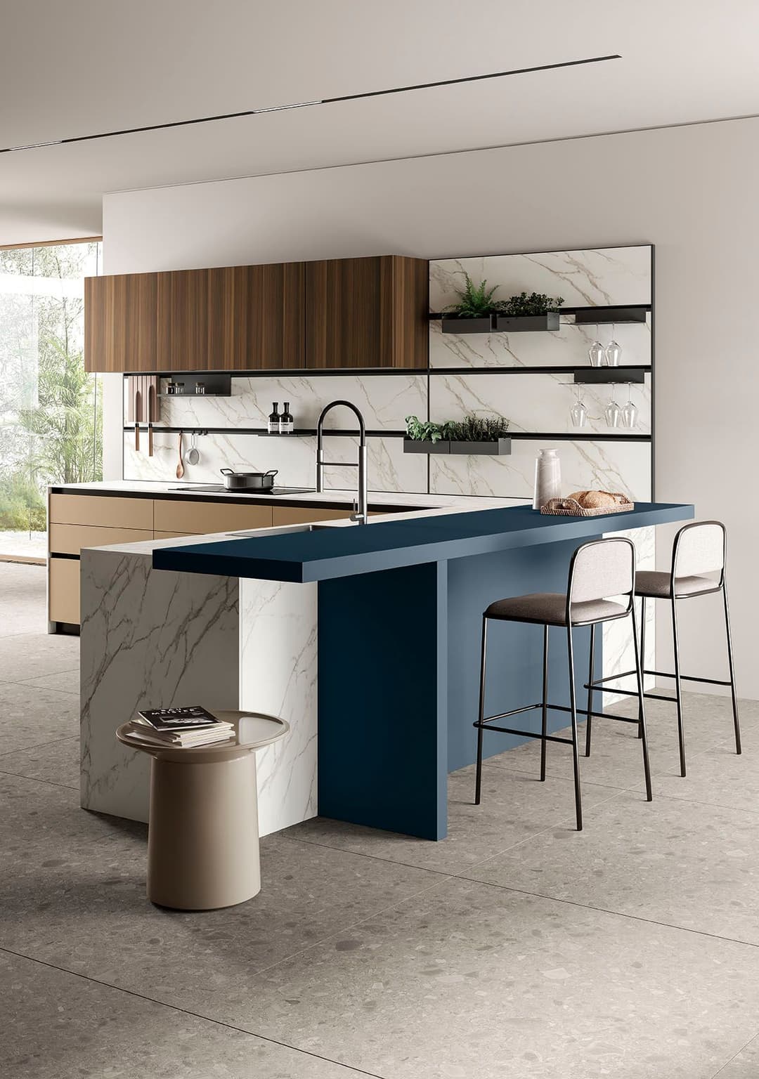 The worktop and backrest are in Neolith Calacatta Silk. The Moove equipped boiserie, functional and decorative, can contain all sorts of accessories. The single door of the wall unit made up of 180 cm in Eucalyptus melamine with a hinged opening hides the hood.